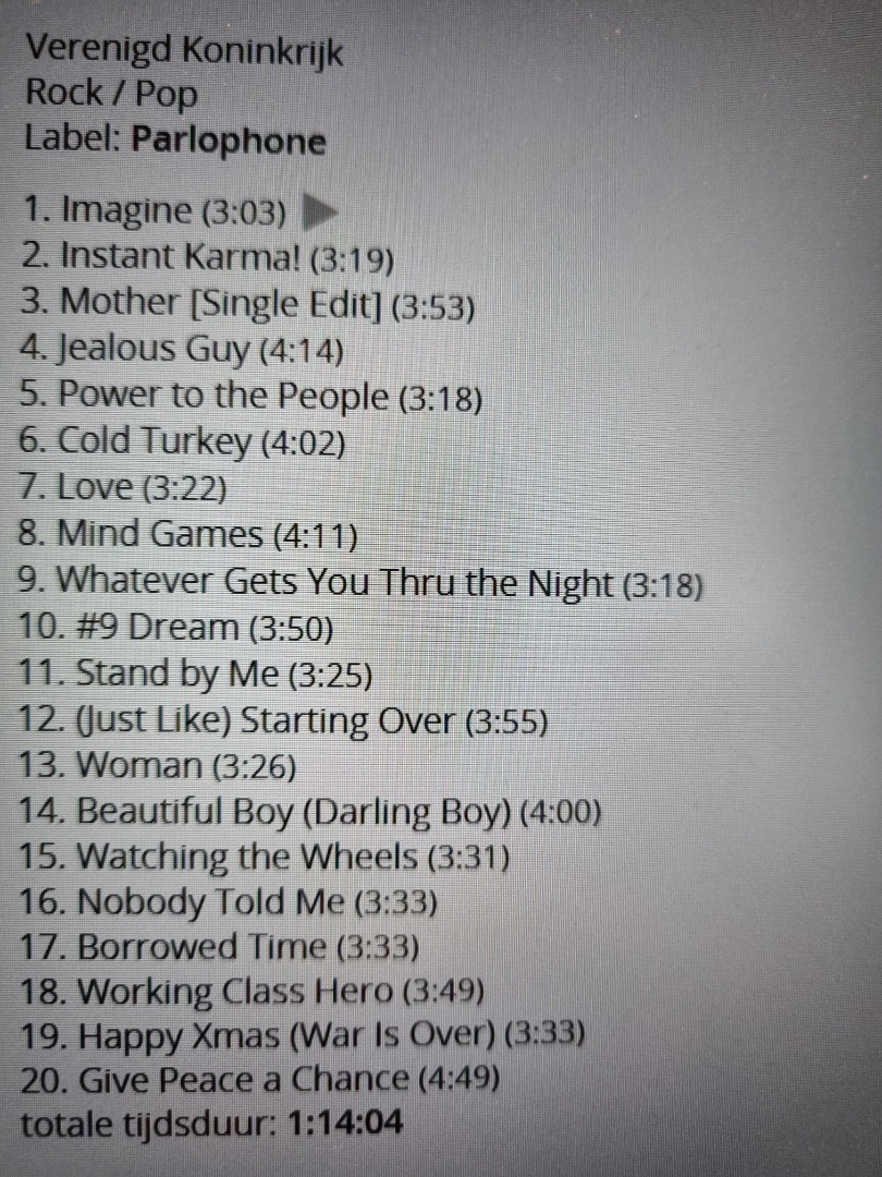 Voer deze EAN-code in een zoekmachine of een muziek-database (b.v. discogs) in voor meer informatie over deze release van de cd Lennon Legend, een verzamelalbum van de Engelse poplegende John Lennon. Vreemd genoeg klopt de tracklist op de achterinlay niet, maar staan wel alle twintig tracks op de cd die er op horen.