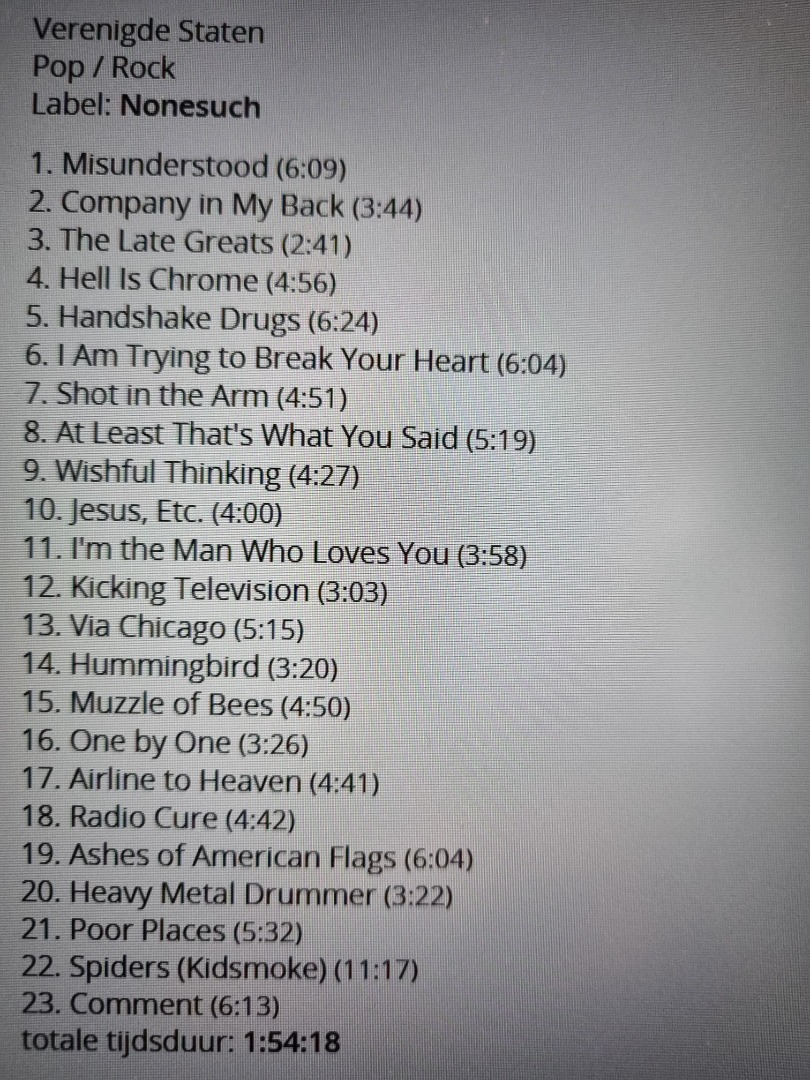 Voer deze EAN-code in een zoekmachine of een muziek-database (b.v. discogs) in voor meer informatie over deze release van de cd Kicking Television ; Live In Chicago, het live-album van de Amerikaanse alternative-rockband Wilco.
