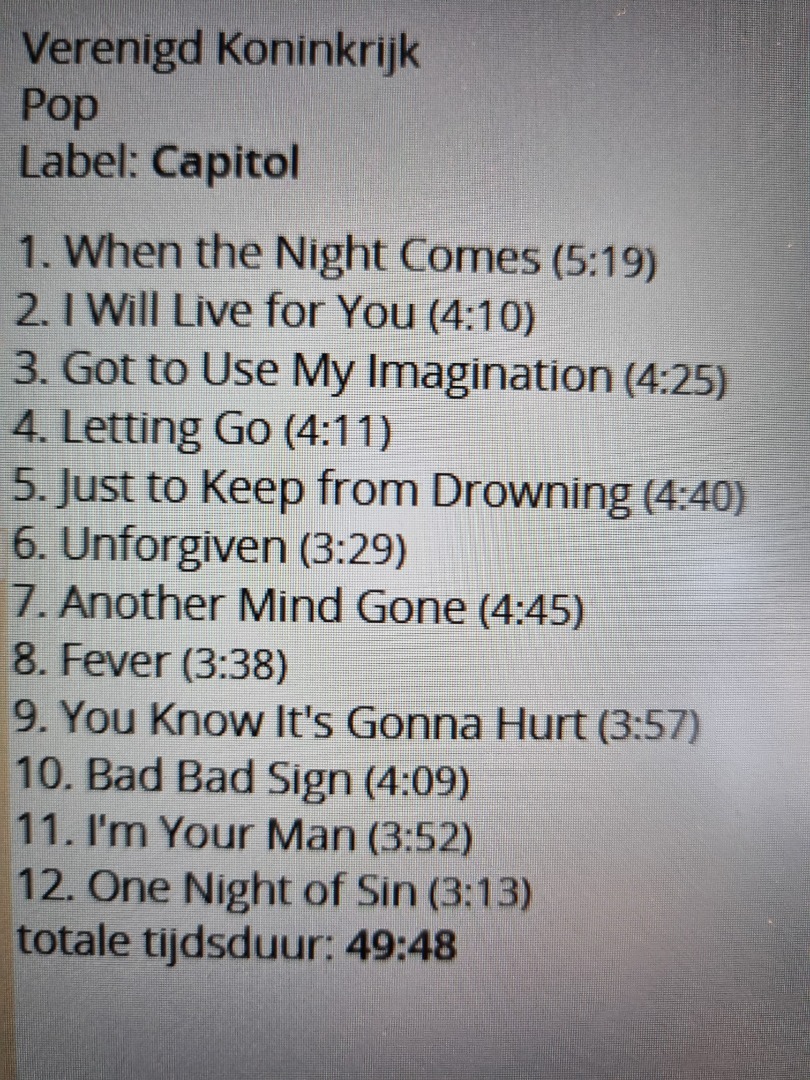 Voer deze EAN-code in een zoekmachine of een muziek-database (b.v. discogs) in voor meer informatie over deze release van de cd One Night Of Sin, het twaalfde reguliere album van de in 2014 overleden Engelse bluesrockzanger Joe Cocker.