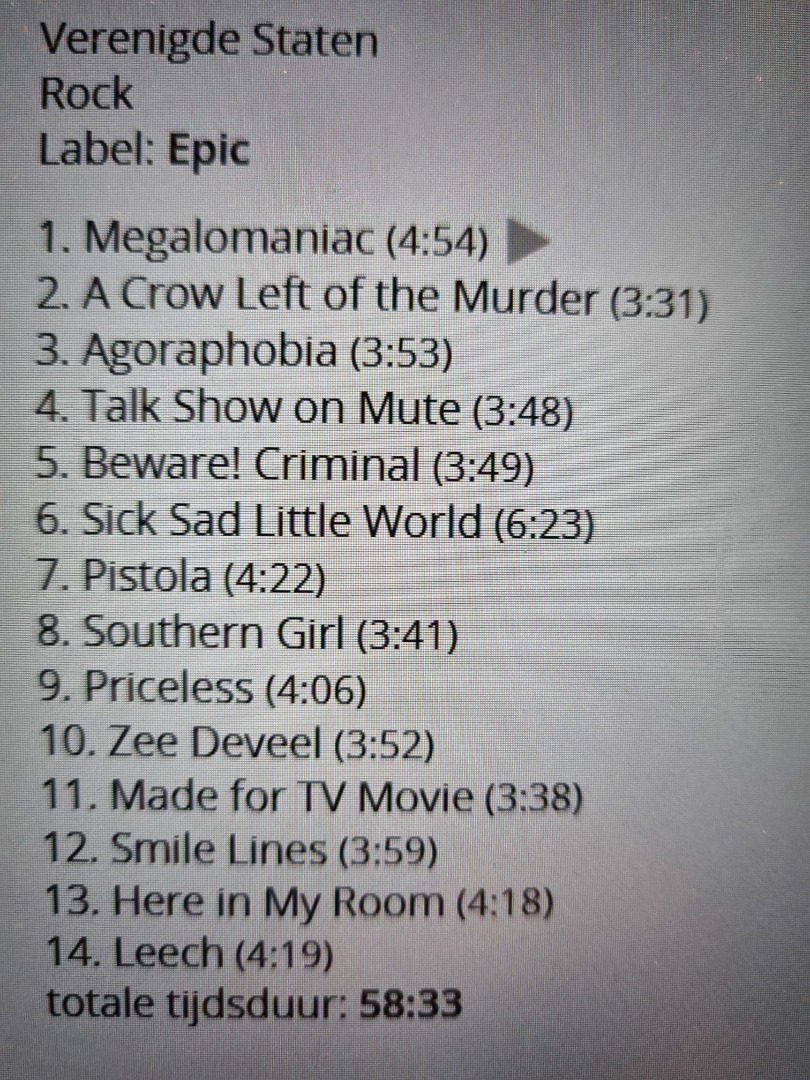 Voer deze EAN-code in een zoekmachine of een muziek-database (b.v. discogs) in voor meer informatie over deze release van de cd A Crow Left Of The Murder, het vijfde reguliere album van de Amerikaanse rockband Incubus.